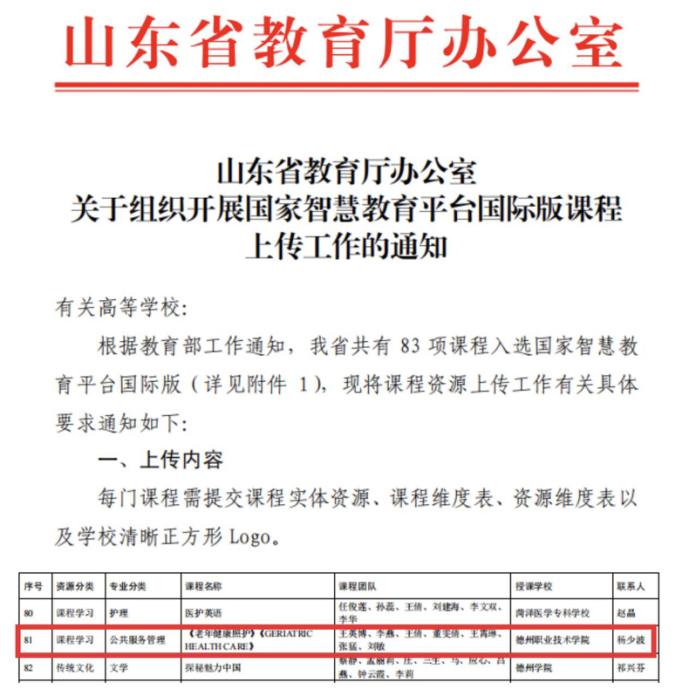 近日,山东省教育厅下发《关于组织开展国家智慧教育平台国际版课程上传工作的通知》,山东省共有83项课程入选国家智慧教育平台国际版,我校《老年健康照护》全英文课程成功入选国家智慧教育平台国际版。