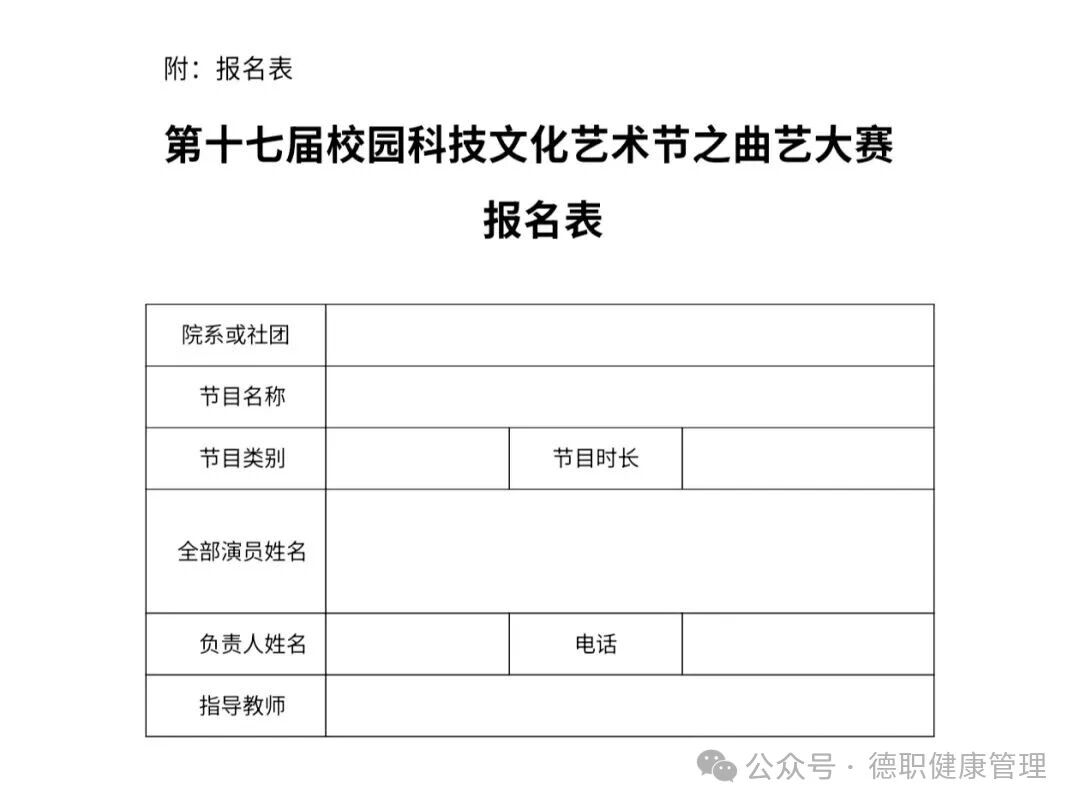 2.海选(10月26日前):由各团总支自主进行,评选出优秀节目参加初赛,并于10月26日前以团总支为单位把作品报名表集体报送到健康管理学院学生科(地点:CJS311),联系人: