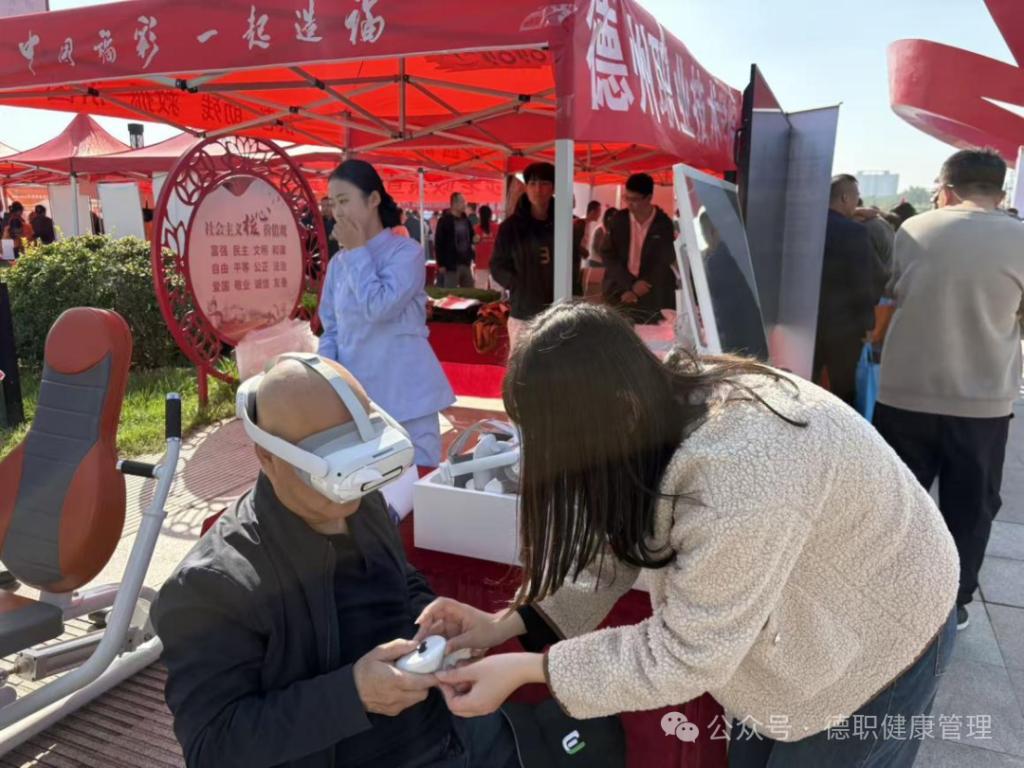 活动现场,德州职业技术学院展台格外引人注目。共设置了视频宣传、虚拟VR眼镜体验,下肢内收外展训练等多个服务项目,吸引了众多老年人积极参与,现场体验,并获得一致好评。德州市民政局局长卢明鹏来到展台前驻足观看,王英博一一介绍了VR虚拟眼镜、数字OT评估与训练系统等智能设备的名称以及功能,可以为老人们提供全面、细致的健康体验。