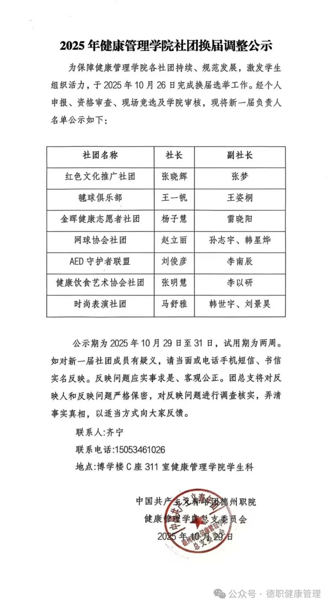 2025年健康管理学院社团换届调整公示