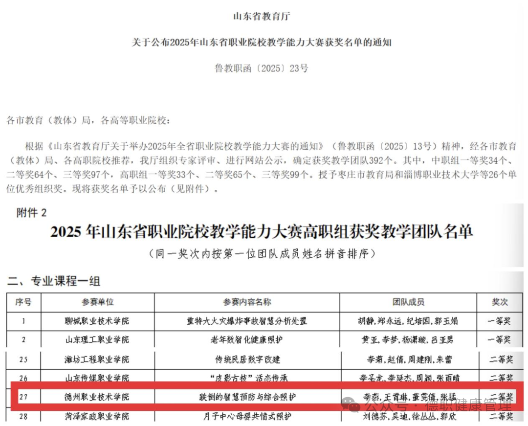 近日,2025年山东省职业院校教学能力大赛获奖名单正式公布,我校李燕、张猛、董雯倩、王霄琳老师的参赛课程《跌倒的智慧预防与综合照护》获大赛(高职组)专业课程一组二等奖。