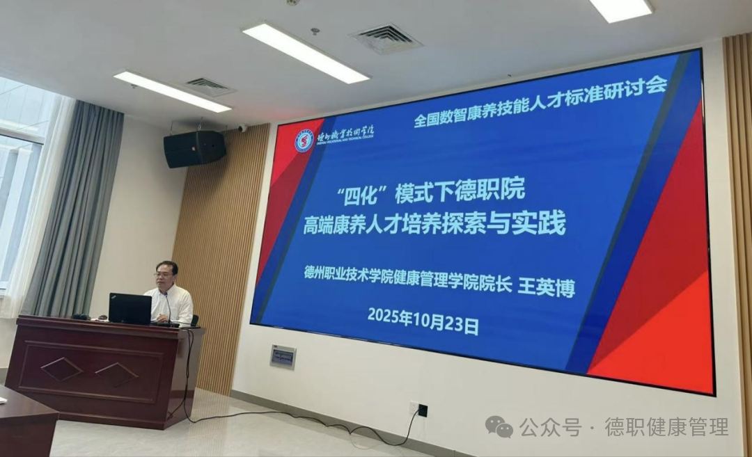 特邀报告环节,王英博以《“四化”模式下德职院高端康养人才培养探索与实践》为题作专题报告。首先介绍了学校发展定位、学科专业取得的成绩以及智慧健康养老服务与管理省级高水平专业群建设、高端康养人才培养路径等。重点讲解了我校“四化”育人模式,全面梳理了我校康养育人的经验。相关实践成果已落地转化为产业服务能力,为社会输送了大量的“健康守门人”。报告彰显了我校在康养教育领域的深入探索与积极实践,厚植康养人文情怀的深厚底蕴与显著成效,得到与会者的充分肯定与赞誉。