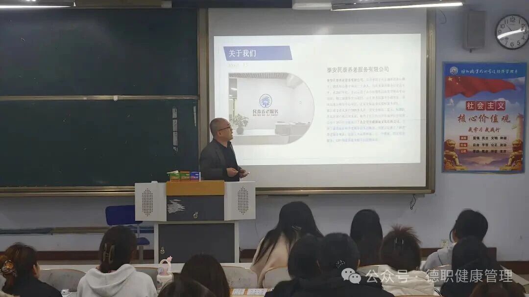 随后,泰安民泰养老服务有限公司进行现场宣讲,详细介绍了企业发展历程、核心业务板块、行业竞争优势及未来发展规划。针对同学们高度关注的校招岗位需求、实习安排、转正机制、技能培训体系及职业晋升路径等内容,企业负责人逐一进行了全面解析,并结合行业趋势分享了求职应聘的实用技巧。