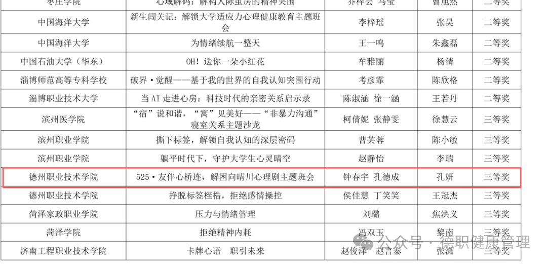 其中,由孔妍老师指导,钟春宇、孔德成同学创作的心理剧主题班会《525·友伴心桥连,解困向晴川》荣获省级三等奖。该作品聚焦朋辈互助主题,以新颖的形式和生动的内容,展现了学生面对心理困扰时的互助成长,获得了评审专家的高度认可。