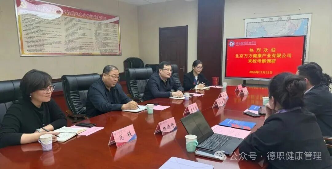 2025年11月13日,北京万方健康产业有限公司董事长鄢红根、总经理杨晓丹一行来我校考察交流。校党委副书记、院长孟繁营,校党委委员、党政办公室主任、宣传部部长朱弘出席座谈会,健康管理学院相关负责人参加会议。