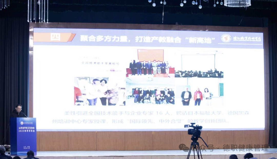 在“学校卫生与健康论坛”交流环节,王英博以《“四化”模式下德职院高端康养人才培养的实践与启示》为题作汇报。他指出,随着“健康中国”战略的深入实施与人口老龄化进程的加快,康养产业已成为国家民生保障与现代服务业的重要组成部分。然而,当前康养行业仍面临“留不住、用不上、干不好”的人才结构性矛盾。作为山东省高水平高职学校建设单位,德州职院紧紧围绕产业需求与卫生健康发展趋势,依托智慧健康养老服务与管理省级高水平专业群,创新构建了“体系化筑基、精细化提质、数字化赋能、品牌化突围”的“四化”育人模式,为区域康养产业输送了一批高素质、复合型技能人才。