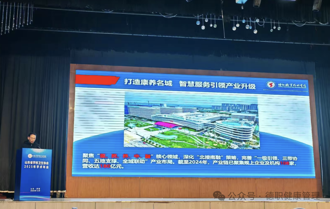 近日,山东省学校卫生协会主办的“2025年学术年会”在山东济南隆重举行。健康管理学院院长王英博受邀参会并作专题报告,分享学校在健康管理与康养人才培养方面的实践与成果。