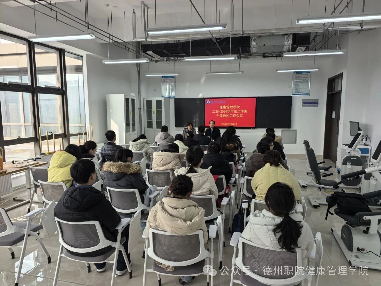 会上,王英博院长首先总结了2025年健康管理学院在人才培养、专业发展、产教融合、人才队伍、国际合作交流等方面取得的成绩,重点部署了新学期工作,如高质量完成高水平专业群验收,技能大师工作室验收还有现场工程师验收等工作。他指出,落实2025年全国教育工作会议精神和学校重点工作部署,统筹做好教育教学各项工作。推进团队能力建设,提升业务与科研水平,搭建成长平台,推动队伍向专业化、研究型发展。深入开展访企拓岗与专业调研,优化人才培养方案和课程标准。组织专业教师开展企业实践、高级实践技能考核,提升教师实践教学能力。做好新建实训室设备使用培训,统一实践教学标准,提高实训室利用率。进一步开展产教融合课程推介,提升课程服务覆盖率。他强调,2026年学院要对标国家“十五五”规划,紧密对接行业发展需求,科学制定学院发展规划与专业建设方案,以更高站位、更实举措推动各项工作提质增效,不断提升我院内涵建设,为学院可持续发展提供坚强保障。