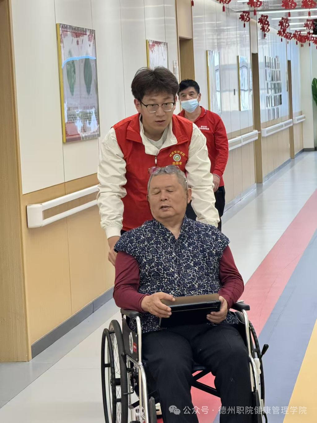 活动现场,一抹抹“志愿红”穿梭其间,同学们迅速分组,默契十足。有的同学细心推着轮椅,陪行动不便的老人晒晒太阳、看看风景,目光始终紧随着长辈的身影,确保每一步都走得安心;有的则围坐床边,拉着老人的手“话家常”——从过往的峥嵘岁月,到日常的吃喝起居,耐心地听、细细地问。这一来一回的问答间,养护院里的冷清被欢声笑语填满,原本独处的孤寂也被这股青春暖流轻轻抚平。