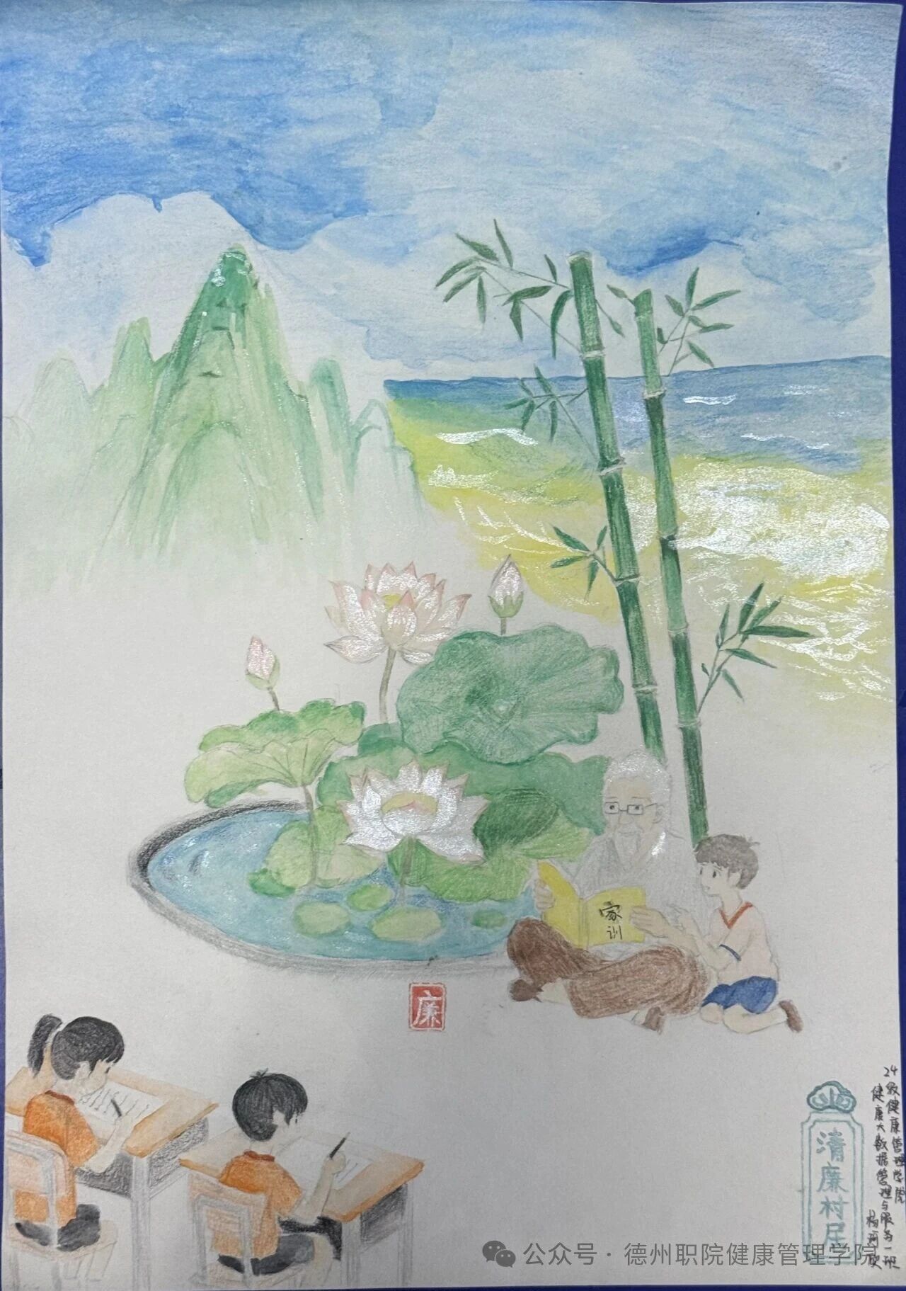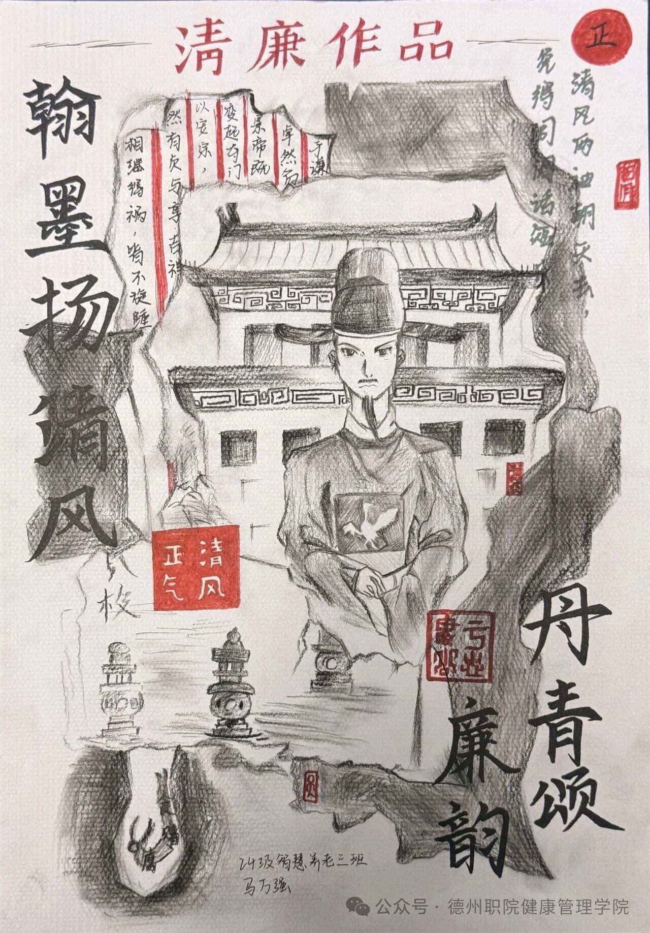 为深入推进廉洁文化建设,积极响应山东省第三届“青未了”杯廉洁文化大赛征集活动,我校高度重视、统一组织,健康管理学院师生踊跃参与、精心创作。本次参赛作品紧扣 “岱青海蓝・廉润四方” 主题,内容丰富、形式多样,涵盖书法绘画、文创设计及文学原创等多个类别。