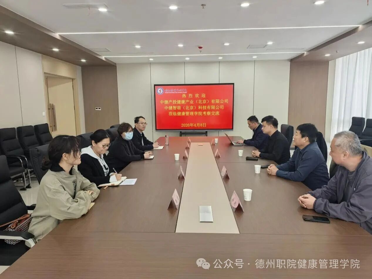 4月8日,中健产投健康产业(北京)有限公司、中健智萌(北京)科技有限公司来我校考察交流。健康管理学院书记范轶、院长王英博、副院长教研室主任杨静秋、综合科科长林玉凯、学生科科长路遥出席座谈会。