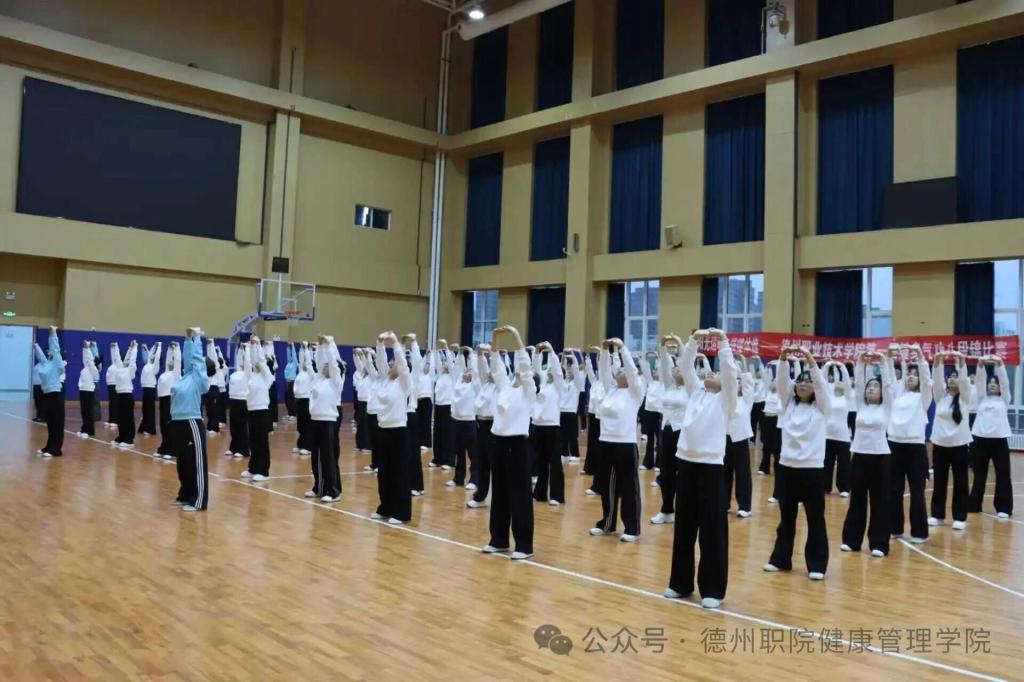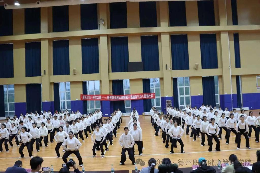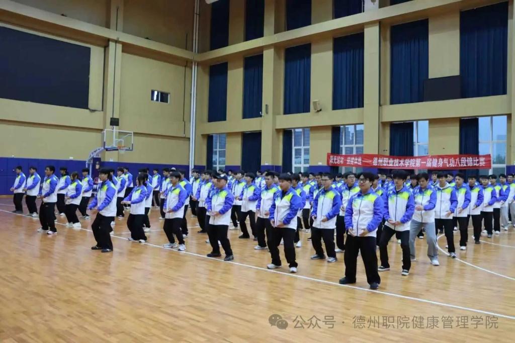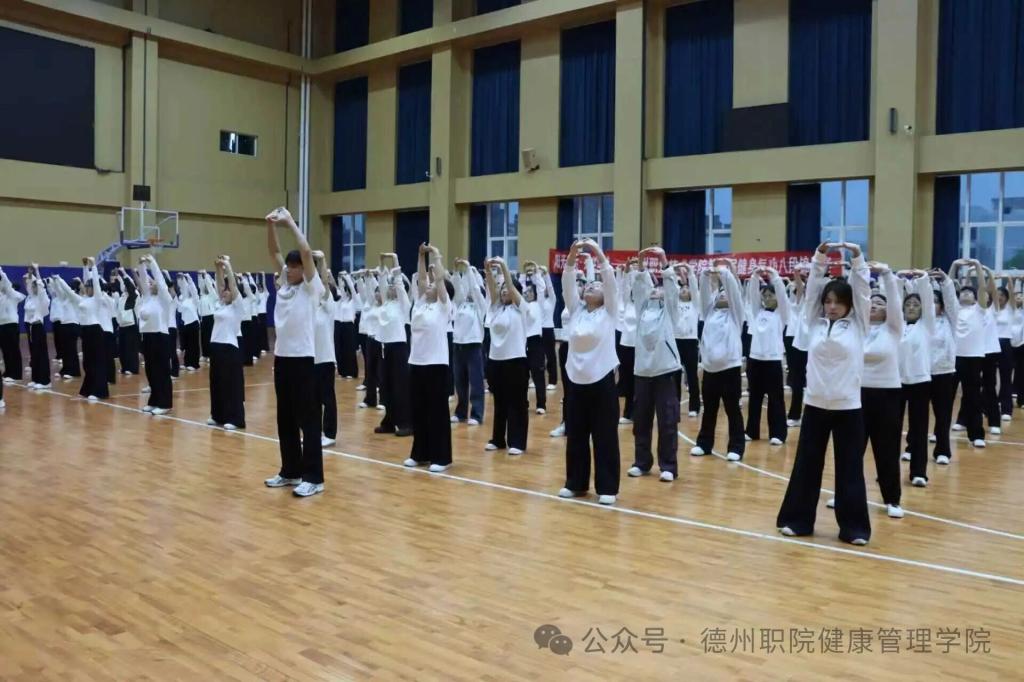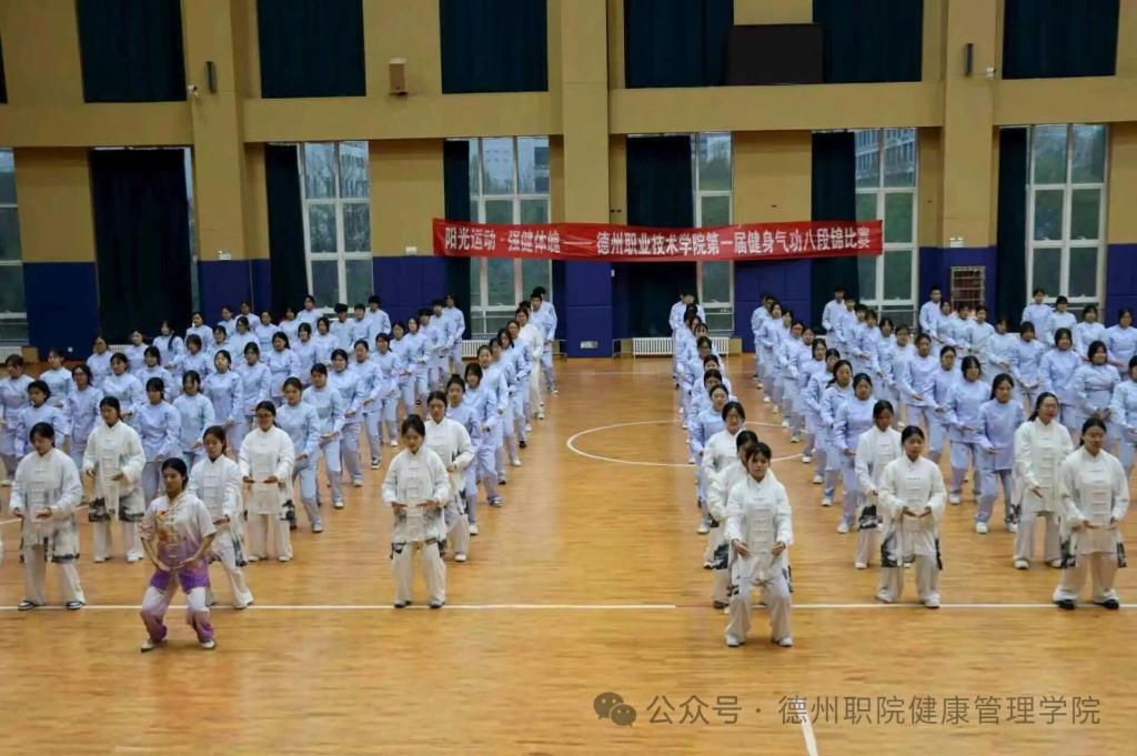 为深入推进阳光体育活动,践行“阳光运动,强健体魄”理念,传承中华优秀传统体育文化,4月8日,德州职业技术学院第一届健身气功八段锦校赛在弘毅楼顺利举行。本次大赛由校学生处、团委主办,健康管理学院承办,校党委委员、副院长刘宏杰、校学生处处长郭吉海、校团委书记王国霞、健康管理学院党总支书记范轶等领导出席活动,与现场师生共同见证这场传承中华传统养生文化的特色盛宴。