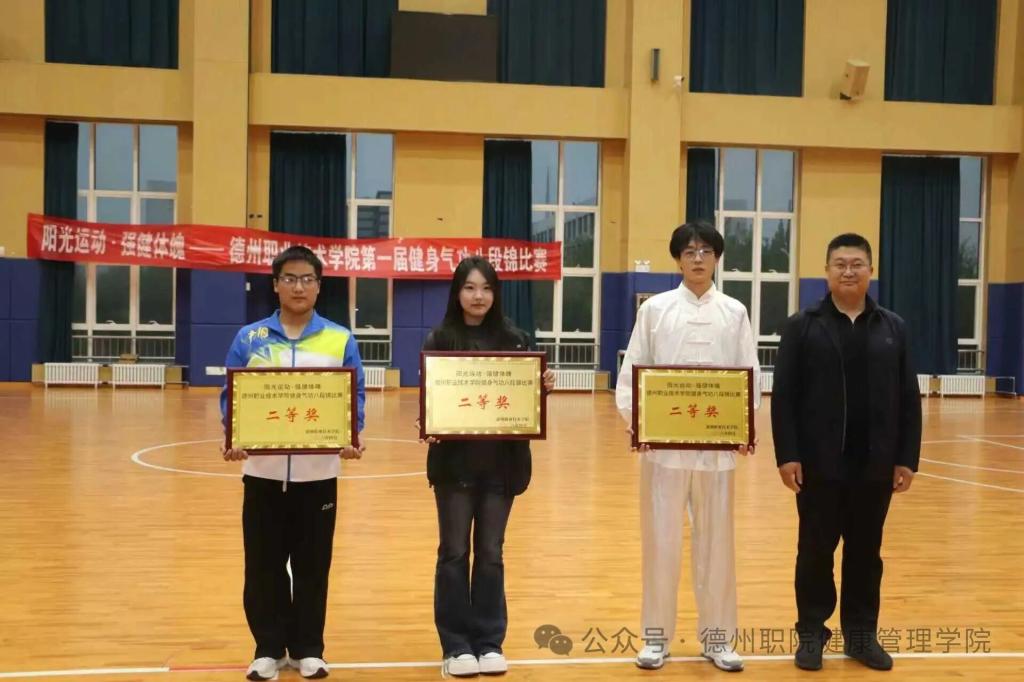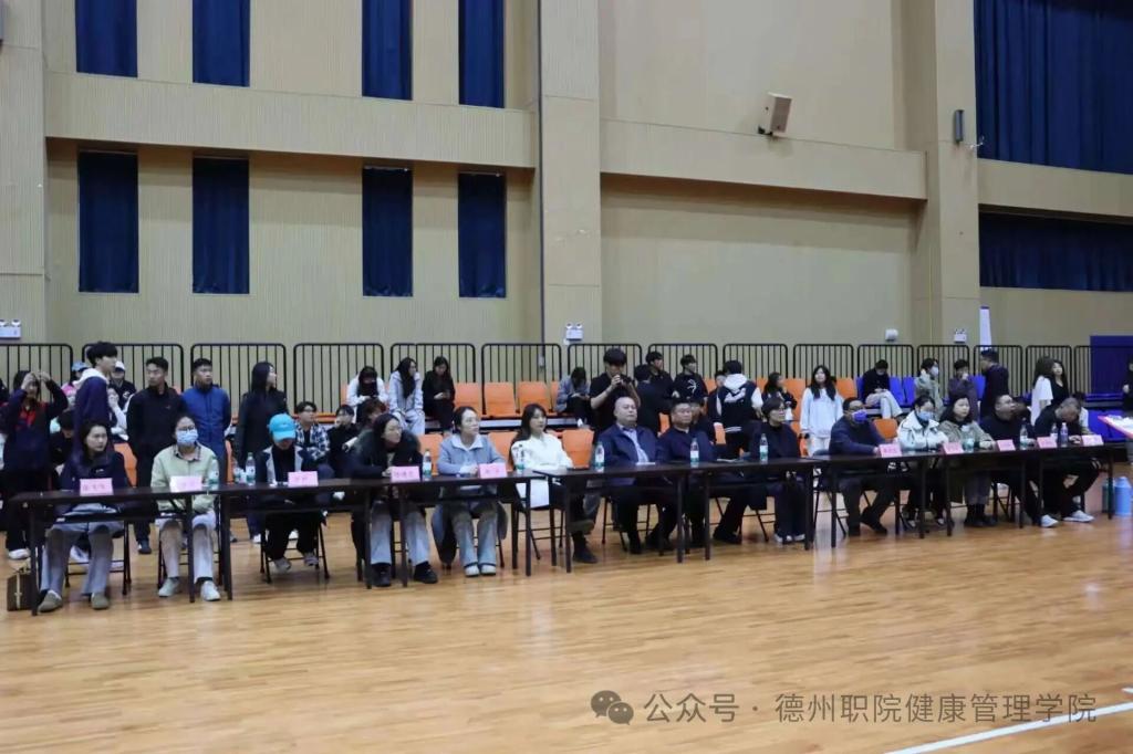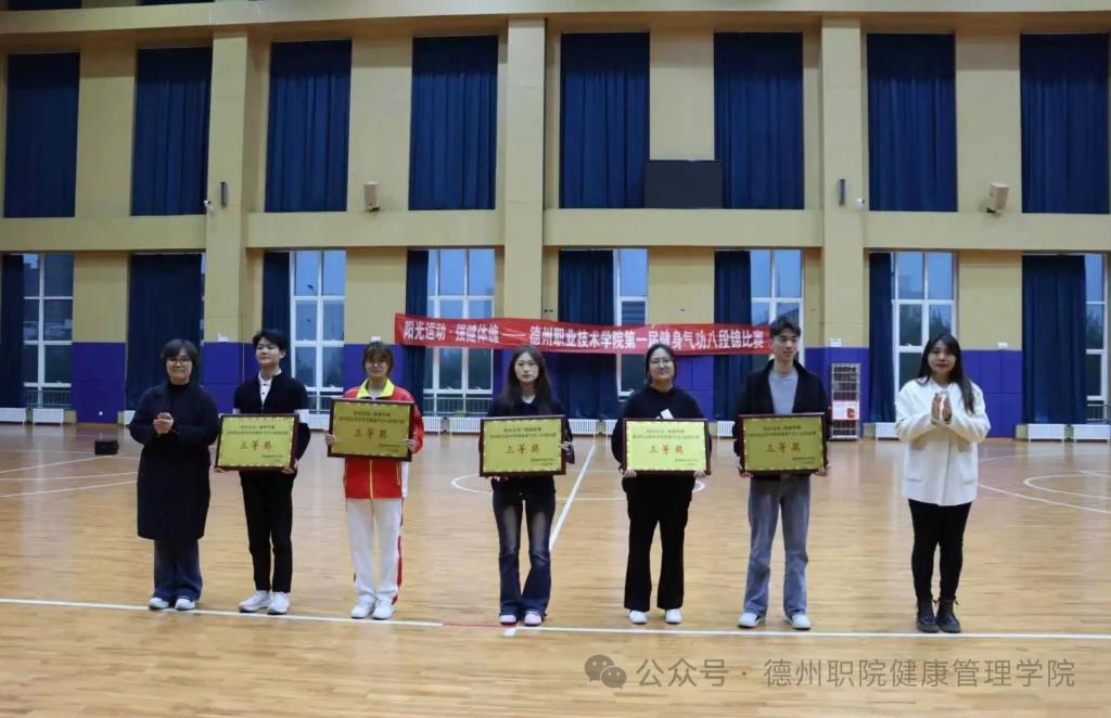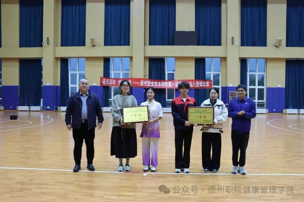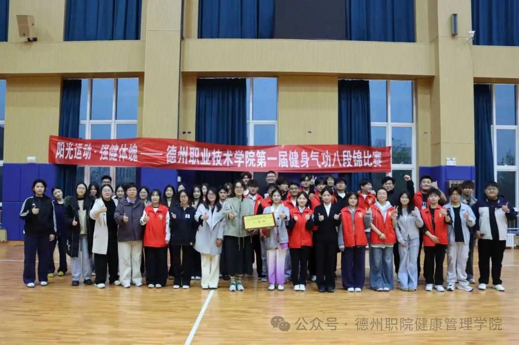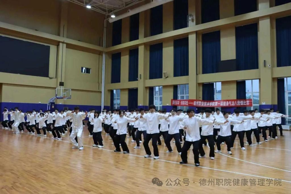 为深入推进阳光体育活动,践行“阳光运动,强健体魄”理念,传承中华优秀传统体育文化,4月8日,德州职业技术学院第一届健身气功八段锦校赛在弘毅楼顺利举行。本次大赛由校学生处、团委主办,健康管理学院承办,校党委委员、副院长刘宏杰、校学生处处长郭吉海、校团委书记王国霞、健康管理学院党总支书记范轶等领导出席活动,与现场师生共同见证这场传承中华传统养生文化的特色盛宴。