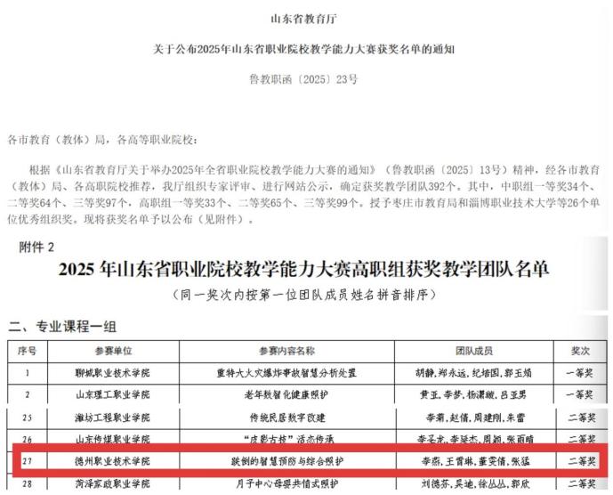 近日,2025年山东省职业院校教学能力大赛获奖名单正式公布,我校李燕、张猛、董雯倩、王霄琳老师的参赛课程《跌倒的智慧预防与综合照护》获大赛(高职组)专业课程一组二等奖。