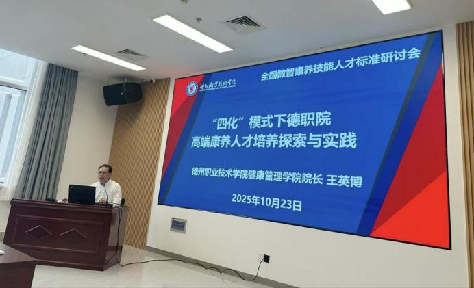 特邀报告环节,王英博以《“四化”模式下德职院高端康养人才培养探索与实践》为题作专题报告。首先介绍了学校发展定位、学科专业取得的成绩以及智慧健康养老服务与管理省级高水平专业群建设、高端康养人才培养路径等。重点讲解了我校“四化”育人模式,全面梳理了我校康养育人的经验。相关实践成果已落地转化为产业服务能力,为社会输送了大量的“健康守门人”。报告彰显了我校在康养教育领域的深入探索与积极实践,厚植康养人文情怀的深厚底蕴与显著成效,得到与会者的充分肯定与赞誉。